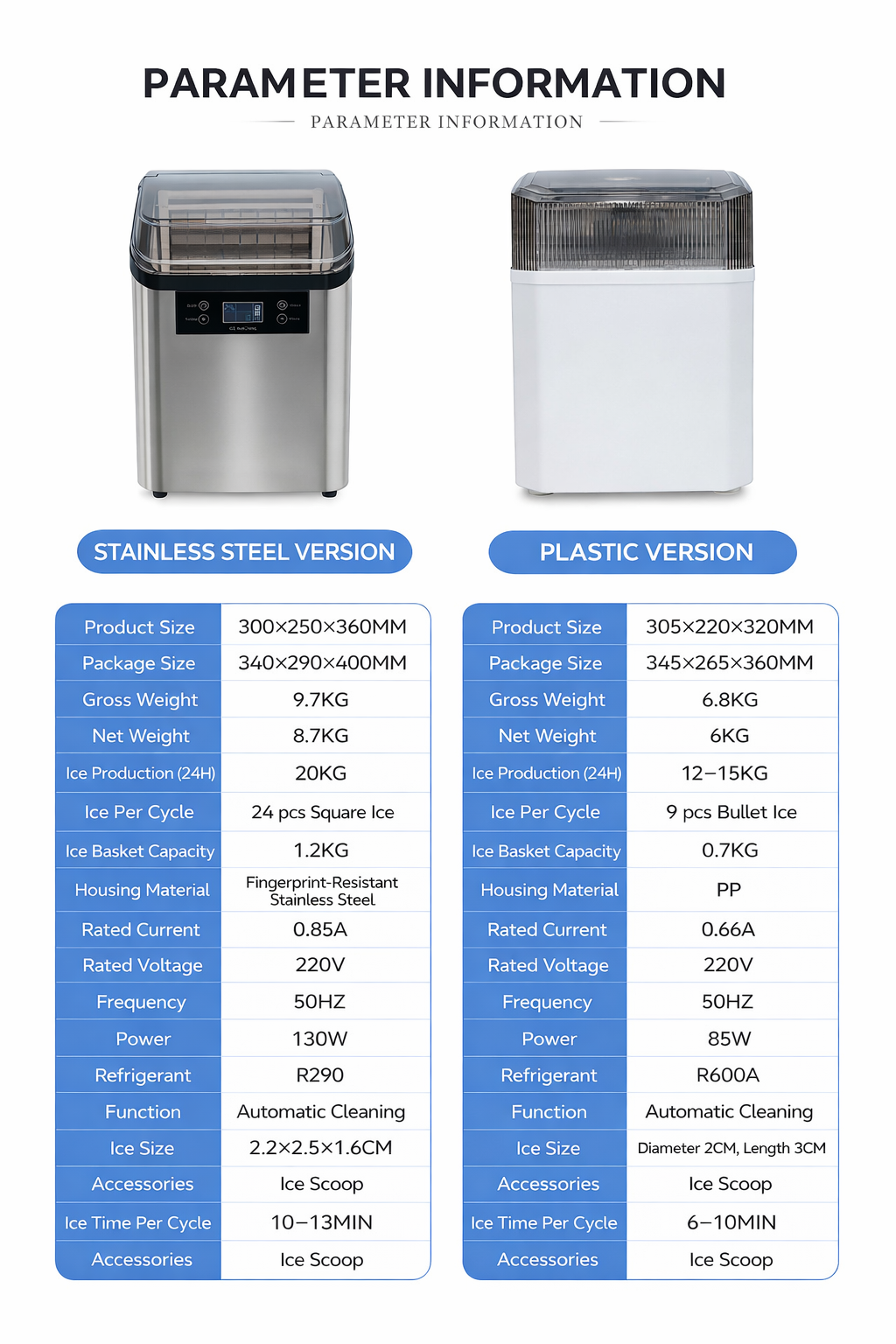 | Dimensione ghiaccio | 2.2 × 2.5 × 1.6 cm | Diametro 2 cm, Lunghezza 3 cm |